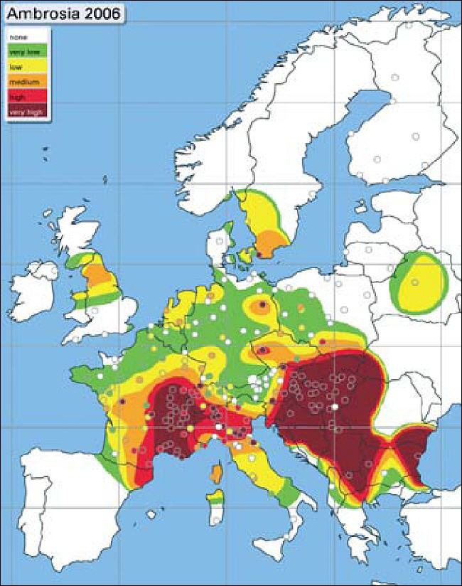 Wertvolle Hinweise auf die Vorkommen von Ambrosia-Bestände liefern Pollenmessungen. Einen Überblick über die Pollenverbreitung in Deutschland und umgebenden Ländern gibt die untenstehende Karte (erstellt von Prof. Dr. S. Jäger, HNO-Universitätsklinik Wien: www.polleninfo.org). Danach weist Deutschlang bislang eine erheblich niedrigere Pollenbelastung auf als die meisten der umgebenden Länder. Zu beachten ist, dass das Pollenmessnetz für Ambrosia-Pollen in Deutschland bislang sehr grobmaschig war. |