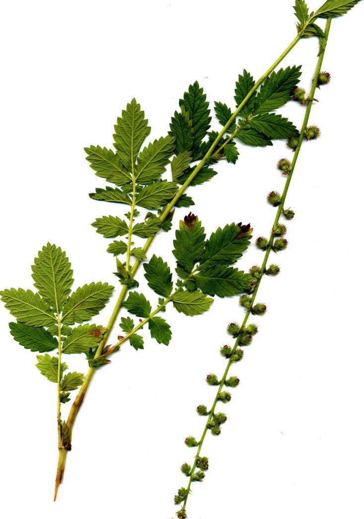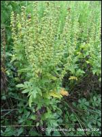 Der bis zu 100 cm hohe Odermennig (Agrimonia eupatoria) zählt zur Familie der Rosengewächse. Die typisch unterbrochen gefiederte Blätter unterscheiden sich deutlich von denen der Beifuß-Ambrosie. Von Juni bis September erscheinen gelbe Blüten (Foto mit Blüten). Die Beifuß-Ambrosia hat im Unterschied dazu keine sichtbaren Blütenblätter. Ähnlich wie bei der Ambrosie sind die Blüten in langgestreckten, ährenartigen Traube angeordnet.