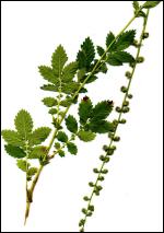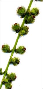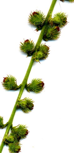 Vergrößerung der Früchte des Odermennig (Agrimonia eupatoria). Es sind Klettfrüchte, die sich im Fell der Tiere festhaken können. Die Früchte der Beifuß-Ambrosie sehen gänzlich anders aus. Früchte