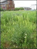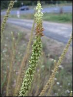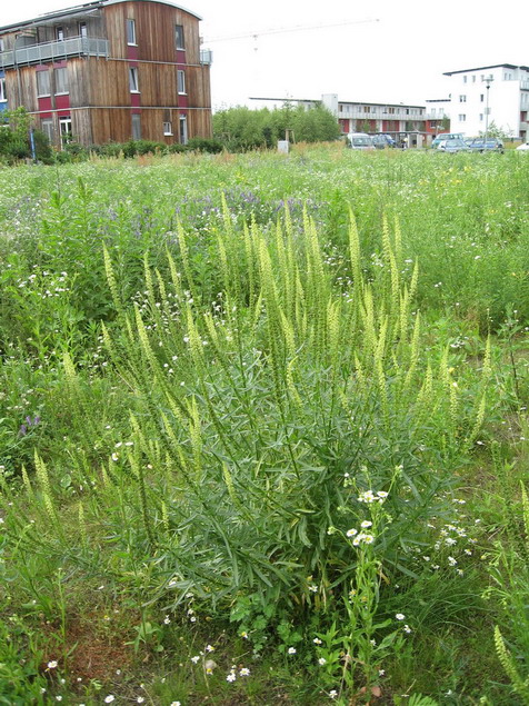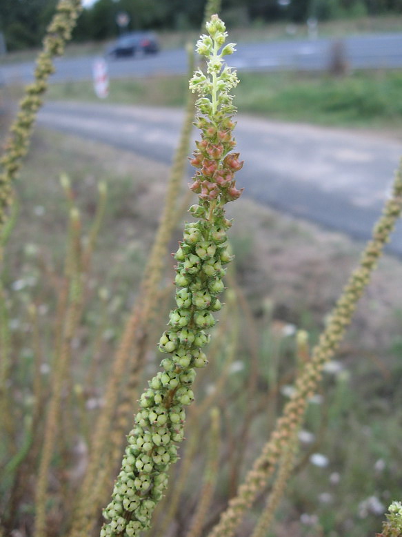 Auschnitt de Blüten/Fruchtstandes der Färber-Resede (Reseda luteola). Aus den Blüten bilden sich beutelförmige, einfächerige Kapselfrüchte in denen sich die Samen befinden. Die Früchte der Beifuß-Ambrosie sehen gänzlich anders aus. Früchte